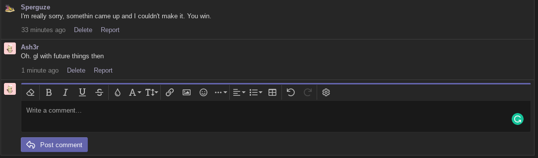 I have contacted my opponent.... who was last seen on 06.04.... which is also the day the account was created. This is just like last week for me. You can call me Luigi because If this goes on like this I will just win the whole thing by doing nothing.