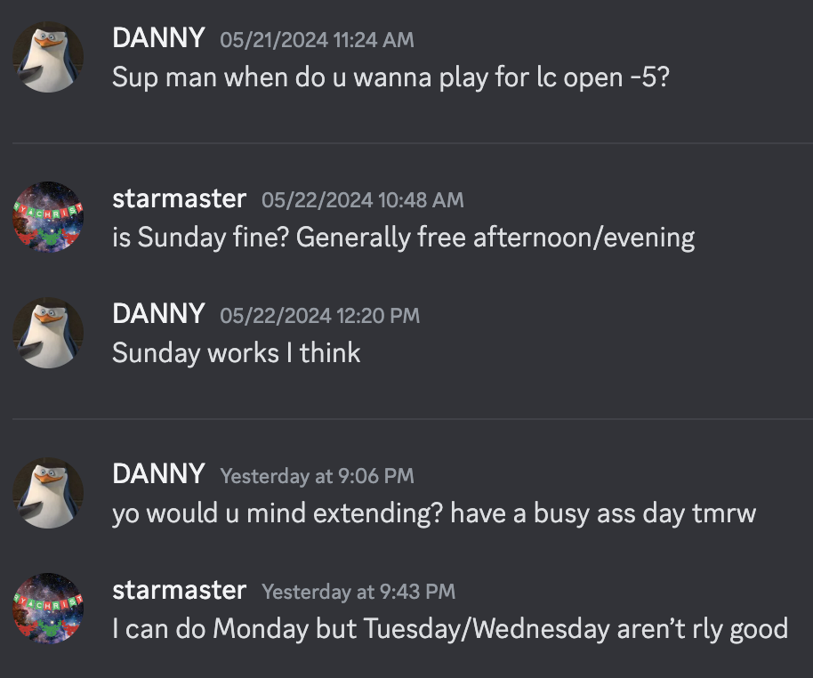 - When scheduling, offer a wide selection of times when you are available to play. 1 hour of activity on one or two weeknights is unlikely to be considered acceptable.