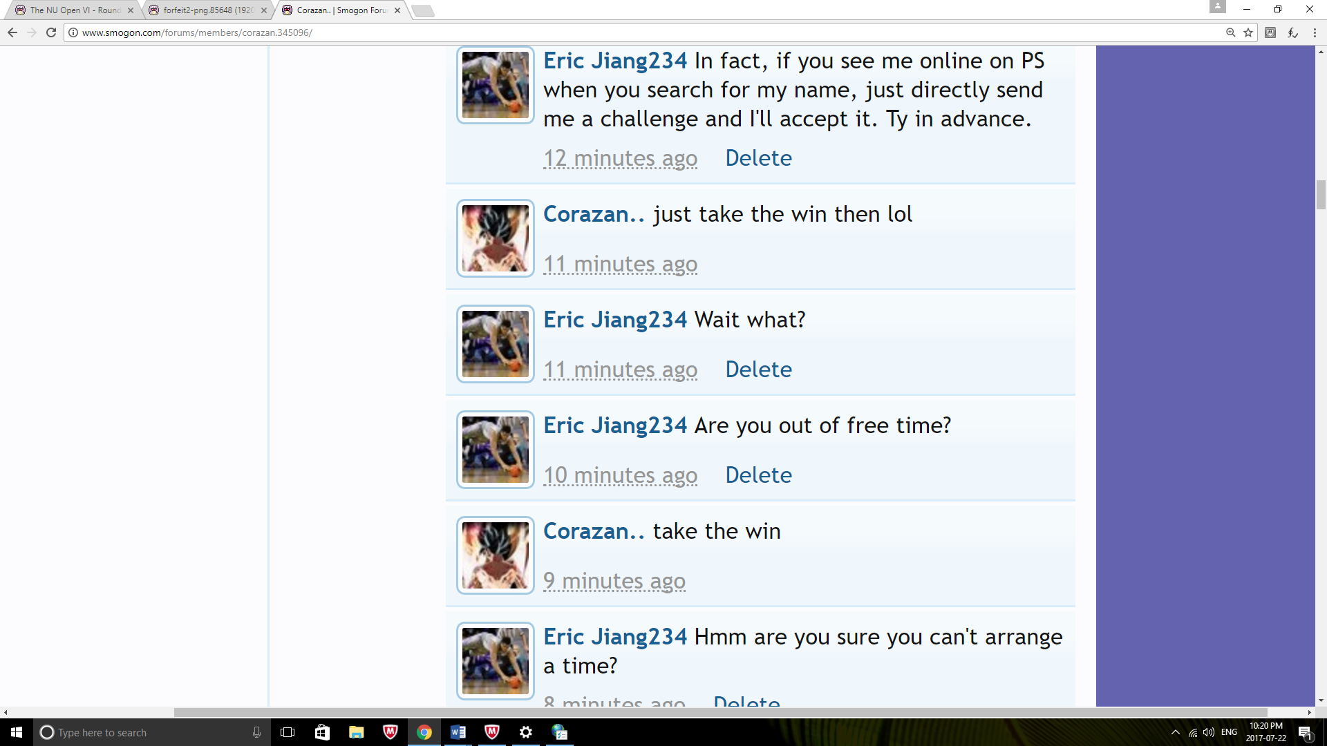 LightCore RaepeRisagamer please try to get this match done. From what it looks like lightcore has listed available times and raepe has only popped online a few times to ask if he can play or has not been specific in scheduling. Look back at your conversations to see when you're both available and schedule an exact time or at least an hour window to get your game done. That way everyone's on the same page and it's clear when and where you are supposed to play