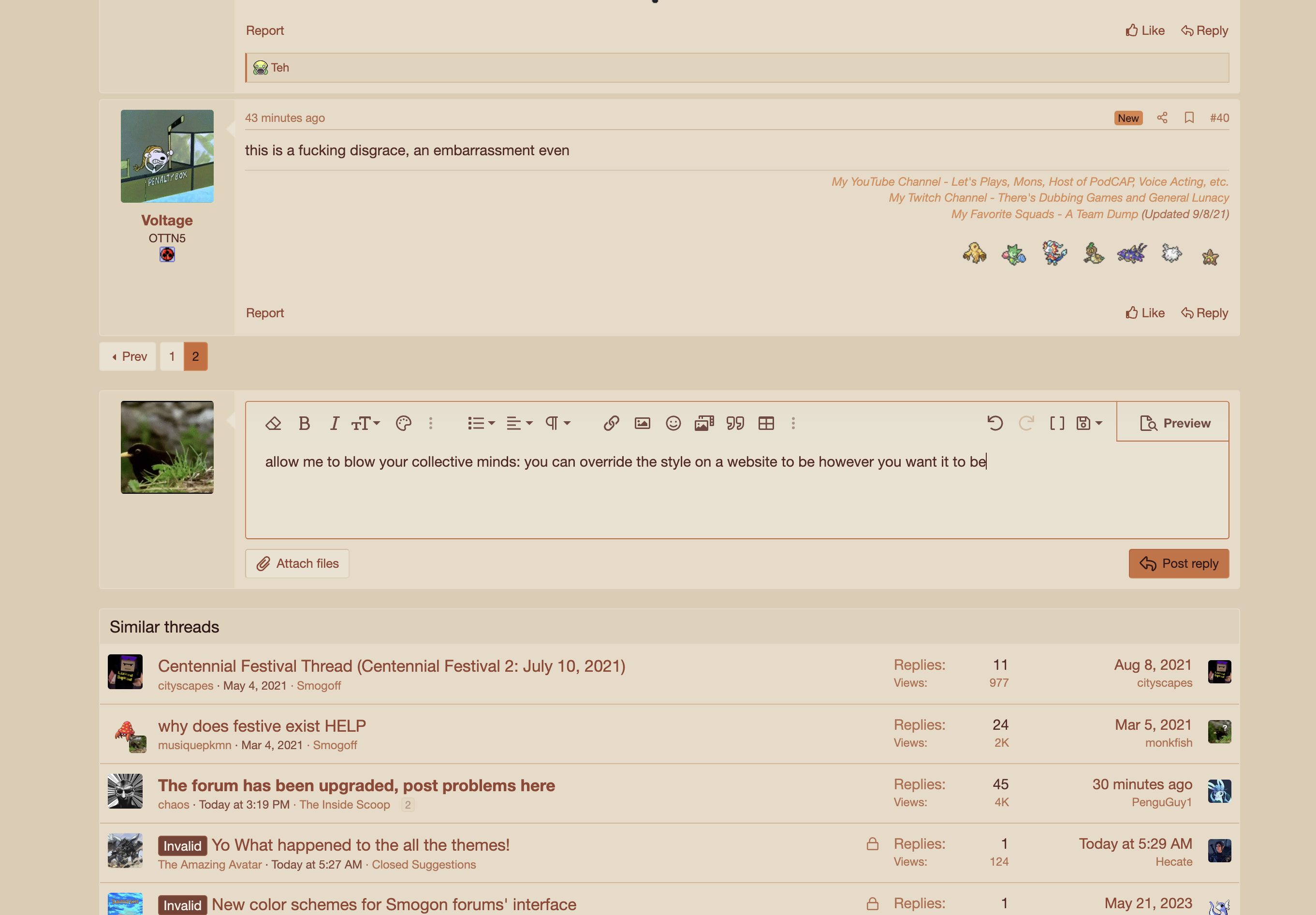 i think returning to only having light and dark themes to choose from will be a character-building exercise for all who had gotten too used to having smogon "spooky" or smogon "festive" grace their screens. for someone like myself who remembers the old days, having a dark theme at all is a luxury. we should be grateful for what we have instead of yearning for themes that probably overstayed their welcomes.