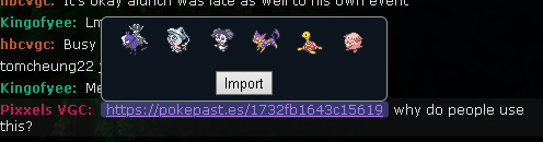 When you hover over a link in chat, 3I generates a hoverable div that shows you a preview of the team contained within, as well as the option to import the team to your teambuilder with a single click. There's also a lot more that this does to deliver the smoothest team-stealing sharing experience you've ever had!