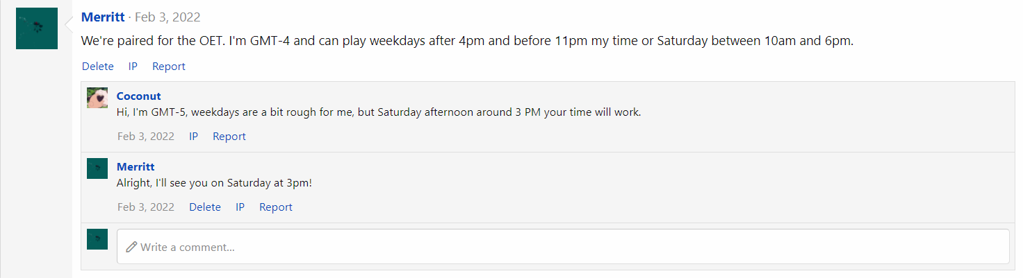 It's acceptable to schedule in other locations, most commonly Discord, but you still want to follow the general structure of a scheduling conversation laid out below. If you do schedule in a different location, make sure you save logs of your scheduling conversation for later (if they're not saved automatically) and post a summary of the scheduling conversation, or at least the final agreed-upon time, in the tournament thread or on either user's wall. That way the host knows this conversation happened, and can use it to make activity decisions.