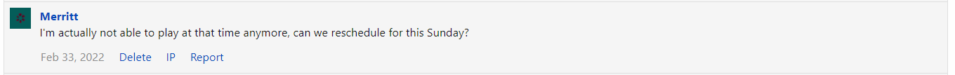 You're User 2 and your opponent has listed their times of availability on your wall. The problem is that none of those times are going to work for you - maybe due to timezone differences and your opponent's asking to play at 2am or you've got a work/school schedule that makes none of those times possible. At this point you want to respond as soon as possible giving all your available times, because there's good odds one or both of you are going to have to play at a less than perfect time.