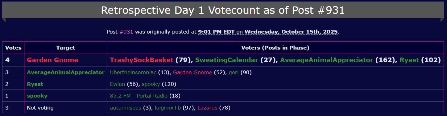 SP is probably not mafia given d1 - unless the team is exactly pulsar/des/SP then they could've saved des by voting pulsar there and it would have been relatively reasonable/easy to do so. Neon could have also saved des d1 but didn't so I guess you can throw them into that bucket too. interesting that the off wagon voters all could have changed at deadline but didn't. usually i feel like mafia throw their vote away on someone random if they can't be on at deadline and that's how offwagons are formed but this time it's different.