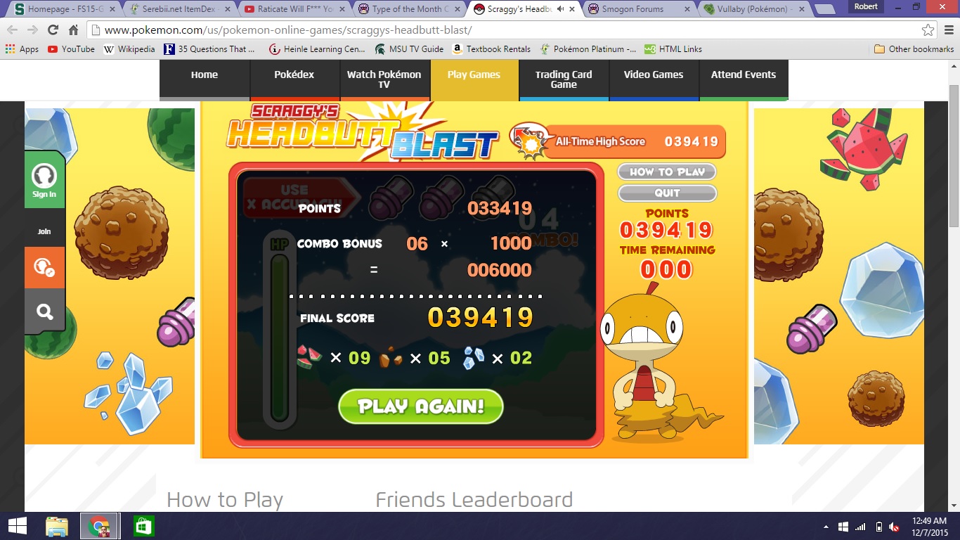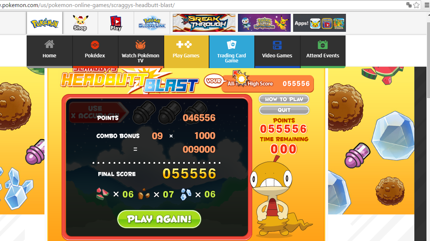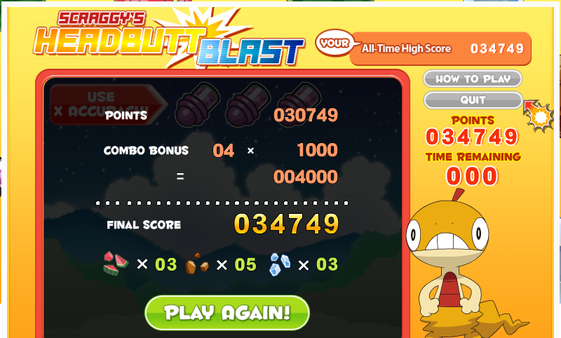 Dang it I missed the Bulbasaur, Q_Q thanks for the giveaway! Anyways, I would like the Scraggy and I think I have the highest score in this game for now. :3