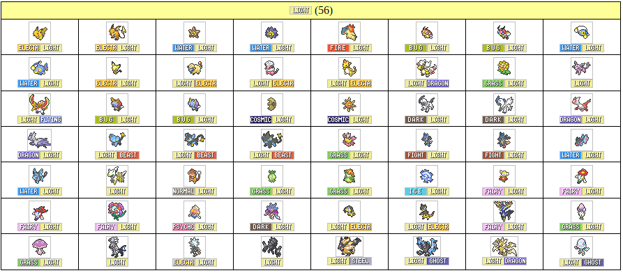 1/2 against Grass (Grass LOVES light.), Fairy (Fairies usually control light), Ground (light can't pass through the ground), Light (light + more light = more light. most elemental types are light this so light makes sense)