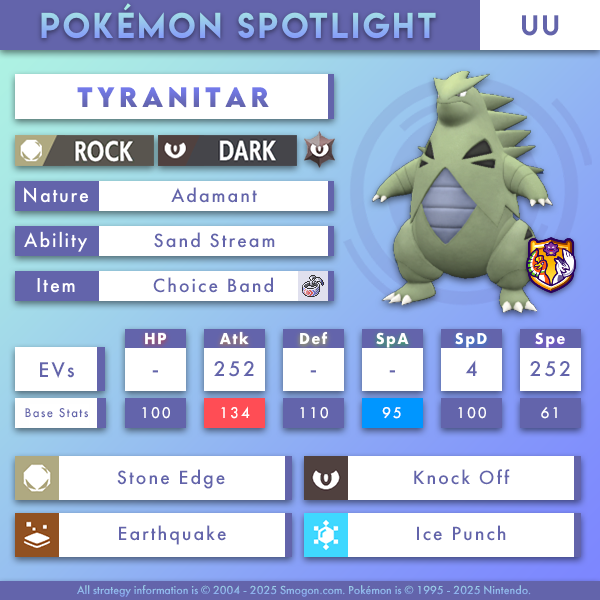 Tyranitar terrorizes UU! Armed with a Choice Band, Tyranitar is a potent physical wallbreaker in UU, with its STAB combination of Stone Edge and Knock Off being able to 2HKO even UU's bulkiest physical walls such as Rotom-W, Toxapex, and potentially even Skamory. Earthquake is invaluable coverage, as it allows Tyranitar to 2HKO Cobalion and OHKO Heatran and Tinkaton, with the latter being OHKOed after Stealth Rock. Ice Punch allows Tyranitar to OHKO Hydrapple, which would otherwise pose major problems for Tyranitar. Choice Band Tyranitar best fits on balance and bulky offense teams as a powerful physical attacker that can leave holes in opposing teams. Excadrill is a great partner for Tyranitar, as it can take advantage of the sand that Tyranitar summons to be able to potentially sweep while also providing Rapid Spin support, which is vital for Tyranitar's ability to wallbreak over a game. Sturdy pivots such as Slowking, Tornadus-T, and Rotom-W can bring Tyranitar in safely. Sinistcha can be an option that can deal with Fighting-types such as Conkeldurr, Keldeo, and Quaquaval.