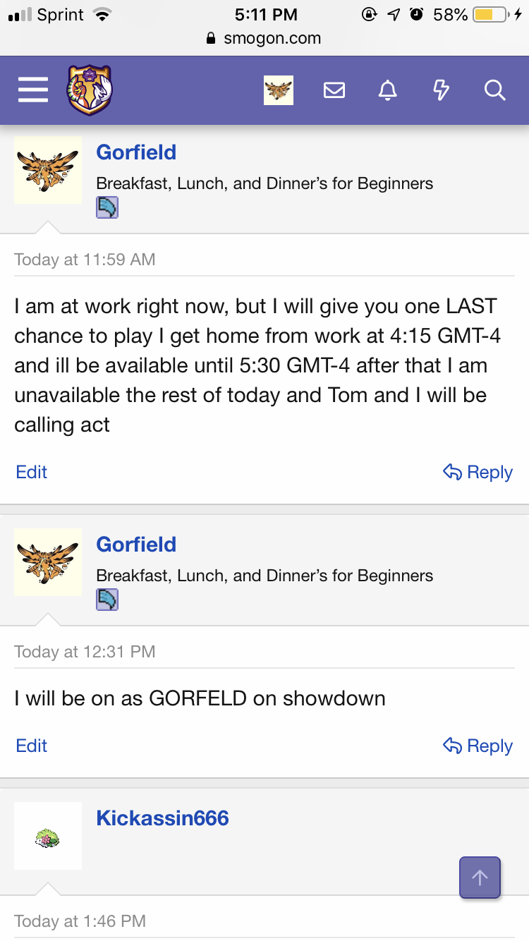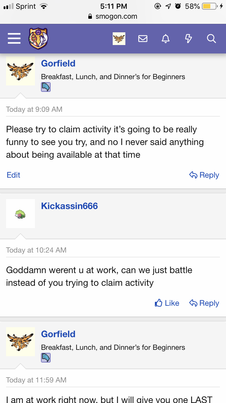 Claiming activity on Gorfield, tried challenging for the past week with frequent conversations, scheduled a date today to battle according to his timings, and he backed out cuz he says he had to go to work