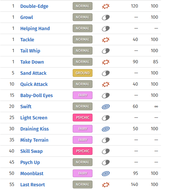 This is Sylveon's level-up movepool in Generation 9. This is the most viable competitive Eeveelution and it gets it sfirst STAB move at Level 30. It gets its second at Level 50.