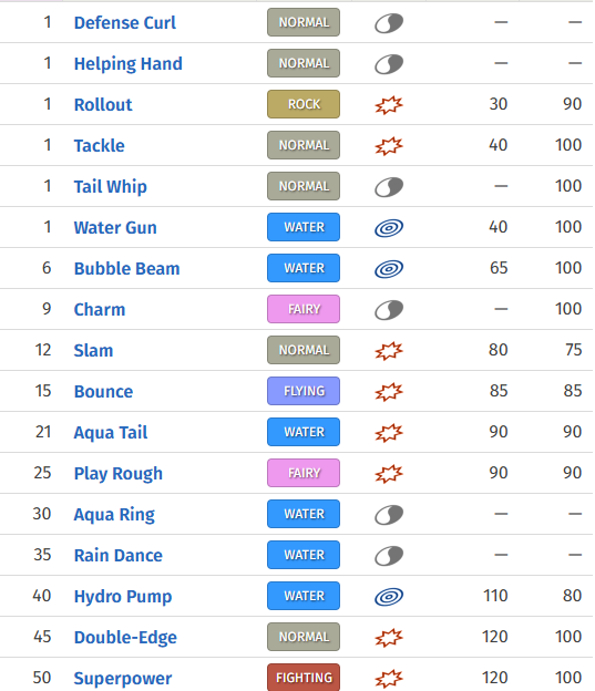Azumarill gets Bounce coverage (genuinely useful in PvE), Superpower, 90 BP physical move at level 21 (or Bubble Beam at Level 6, which matches Vaporeon's Water Pulse at like Level 25) and it has a second STAB + Huge Power.