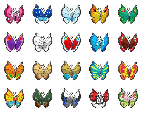 1) I did start with those above sprites, but you can see on their page they said they are free to use for whatever, not to mention said person has even made a website to make your vivillon pattern here: http://cutievirus.com/vivillon/ BUT it's really just the wing edges and basic pattern shape, I recolored/reshaded slightly edited the wings and totally remade the bodies myself
