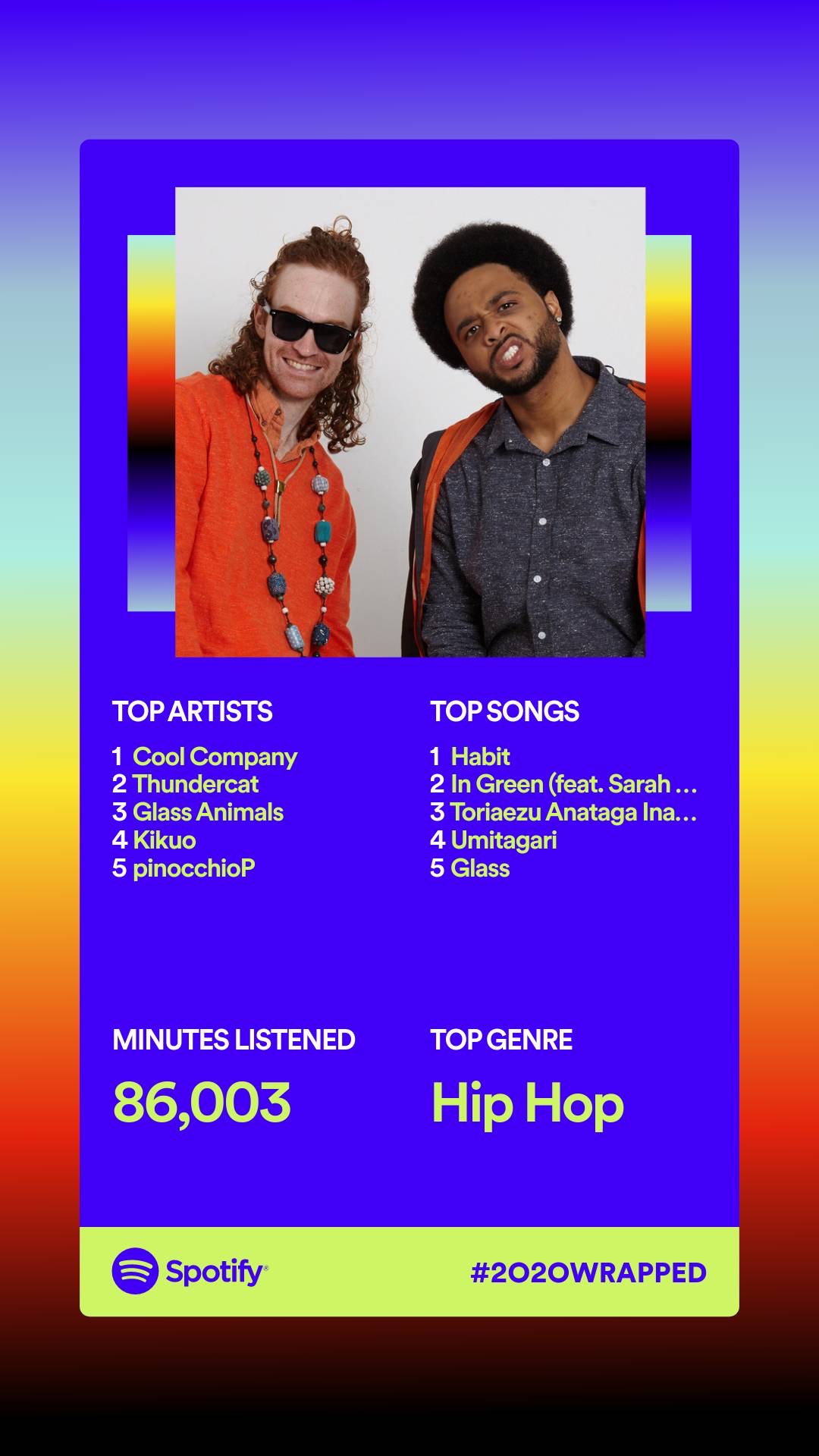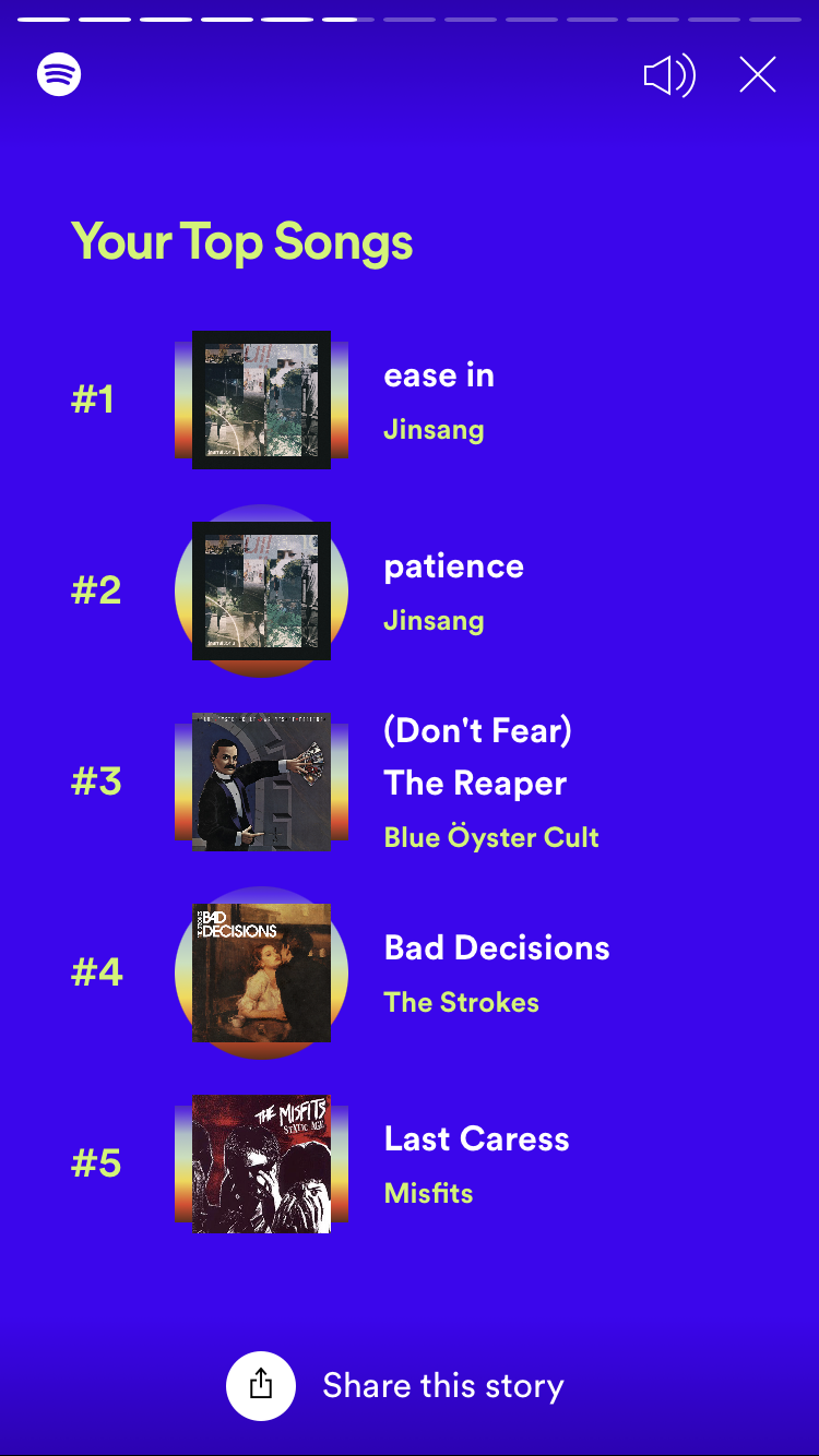 Kinda shocked at 4 and 5—I haven’t listened to Waggaki Band since March, and I really don’t listen to more than one or two Mikito P songs on Spotify. Waggaki Band I guess can be explained by it being backlog from when I still travelled to/from work and my FGC locals, but I have no clue about Mikito P.