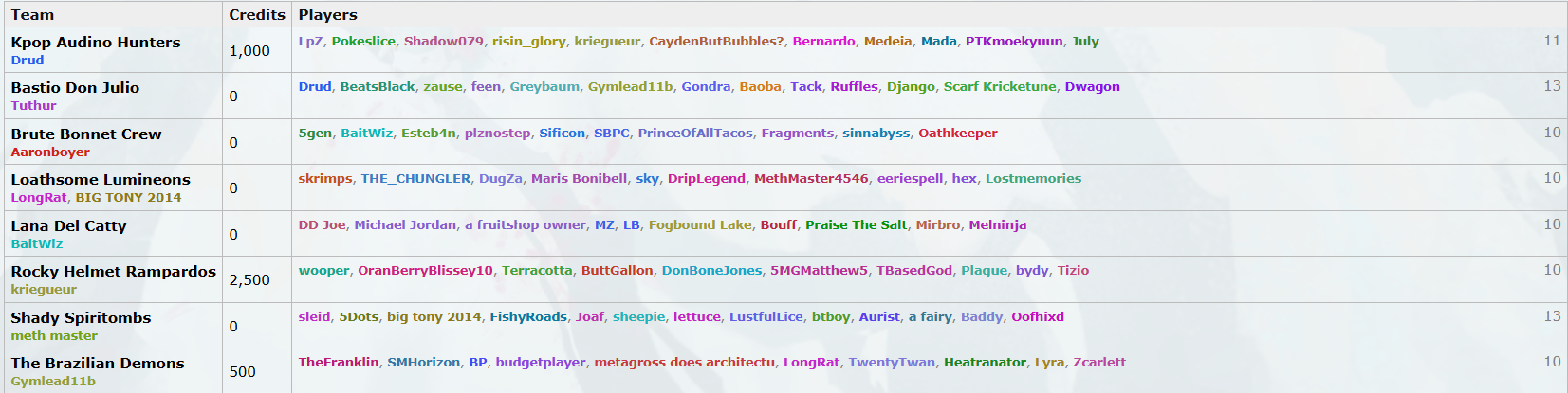 sleid 5Dots lettuce 9000 LustfulLice 9000 FishyRoads 9000 big tony 2014 7000 Joaf 7000 sheepie 7000 btboy 6000 a fairy 4500 Aurist 4000 Baddy 4000 Oofhixd 3000